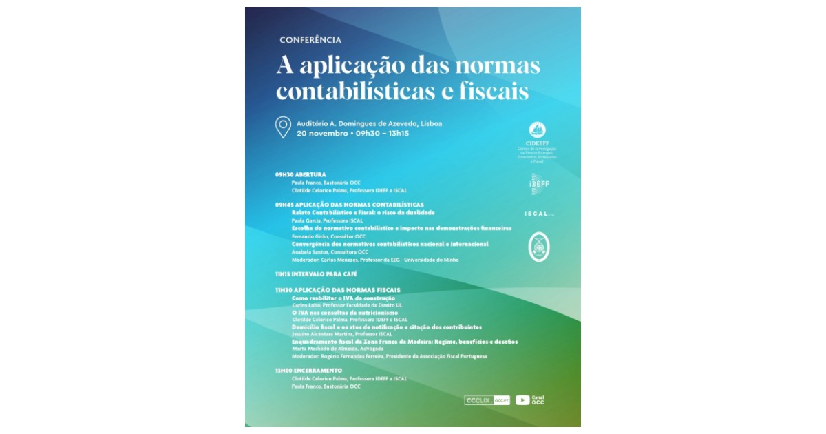 The Order of Chartered Accountants (OCC), in partnership with the Centre for European, Economic, Financial and Tax Law Research (CIDEEFF), the Institute of Economic, Financial and Tax Law (IDEFF), and the Institute of Accounting and Administration of Lisbon (ISCAL), will organise an international conference on the topic "The Application of Accounting and Tax Standards" on the morning of 20th November, at the António Domingues de Azevedo Auditorium in Lisbon.