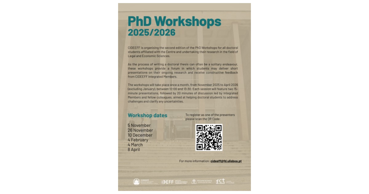 The PhD Workshops are an activity organized by CIDEEFF for all PhD candidates affiliated with the research center and pursuing a doctorate in the field of Law and Economics.