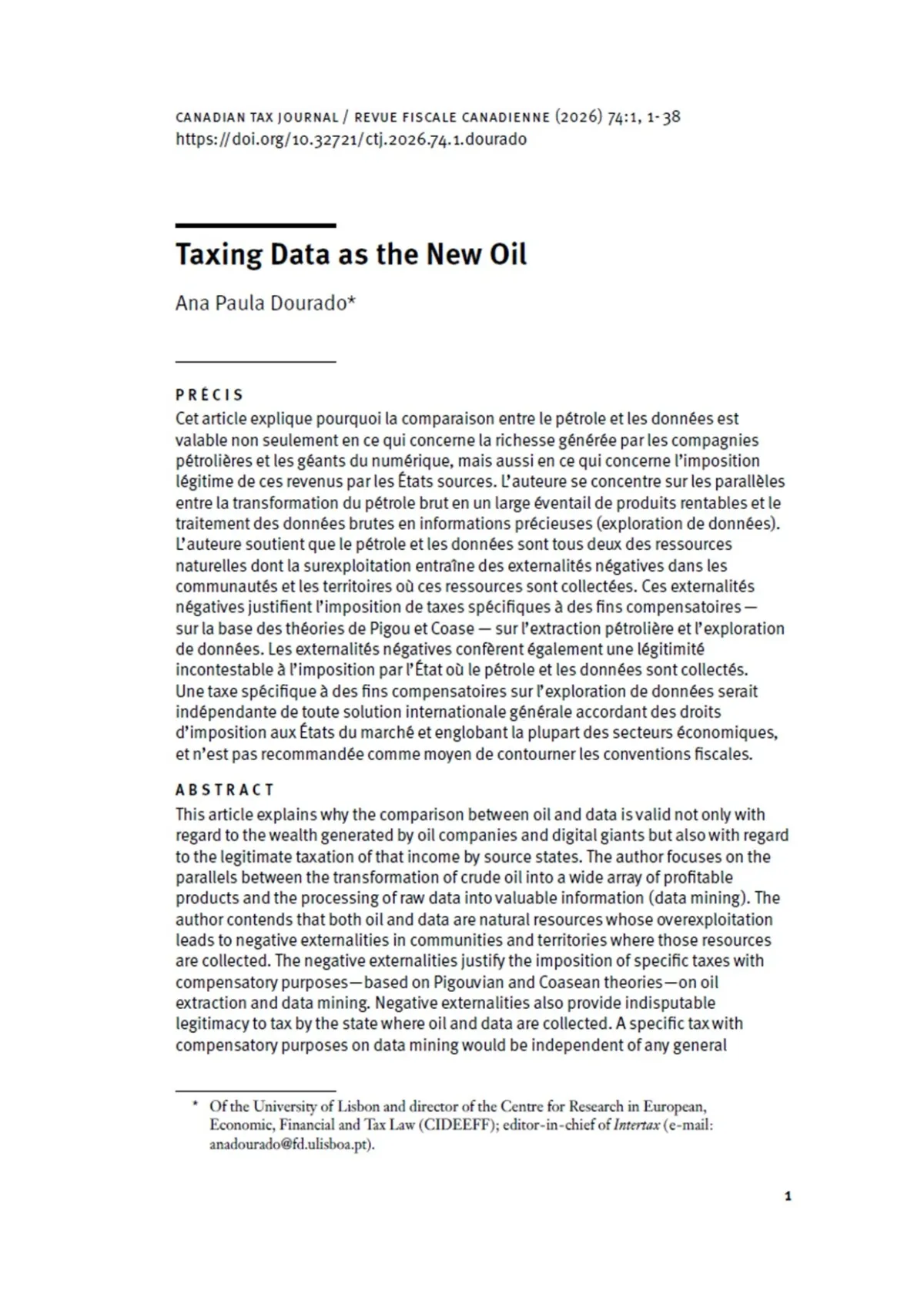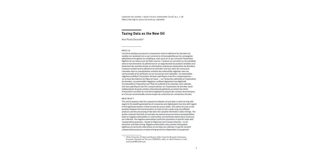 O Centro de Investigação em Direito Europeu, Económico, Financeiro e Fiscal (CIDEEFF) anuncia a publicação do mais recente artigo científico da sua Diretora e coordenadora do grupo de investigação “Tax Governance”, Professora Doutora Ana Paula Dourado, intitulado “Taxing Data as the New Oil”, no prestigiado Canadian Tax Journal.