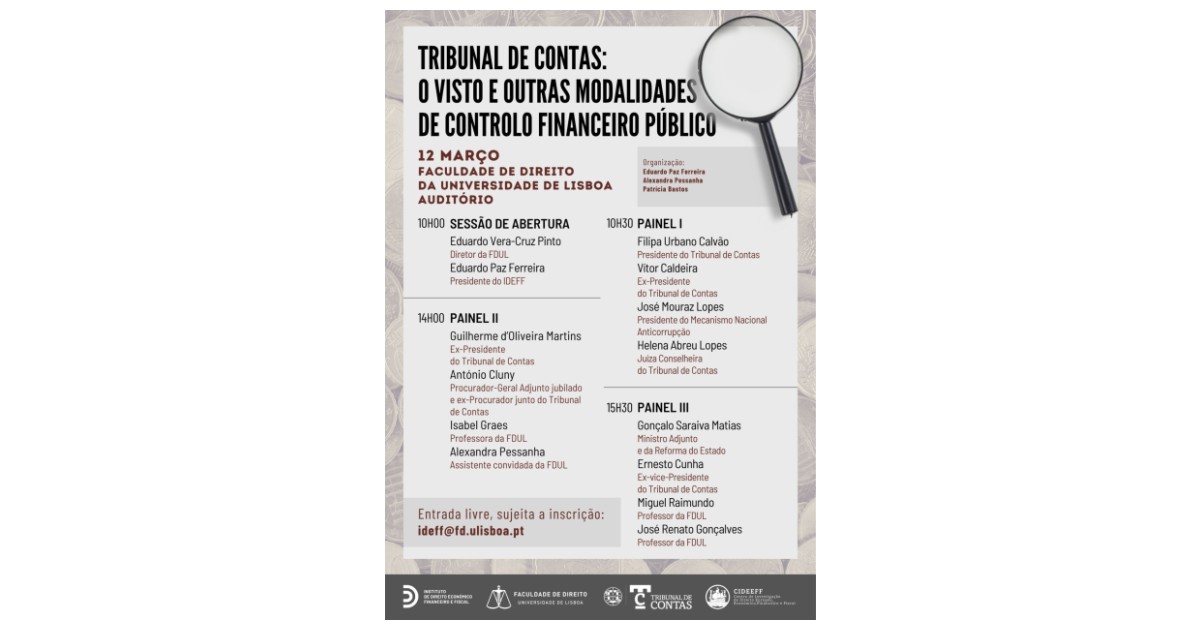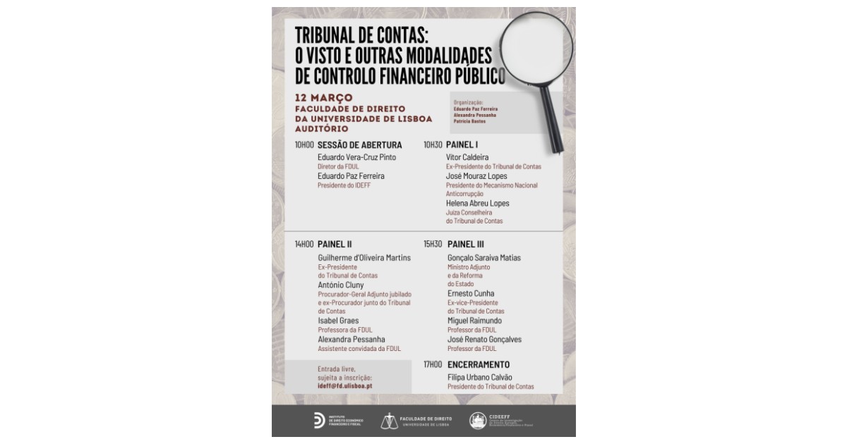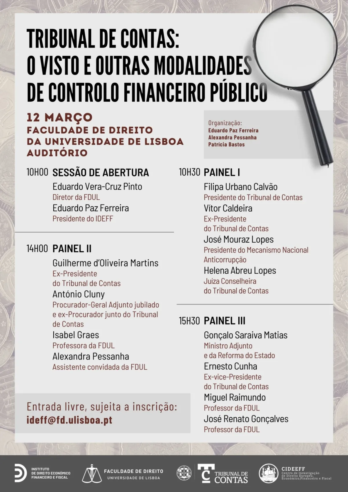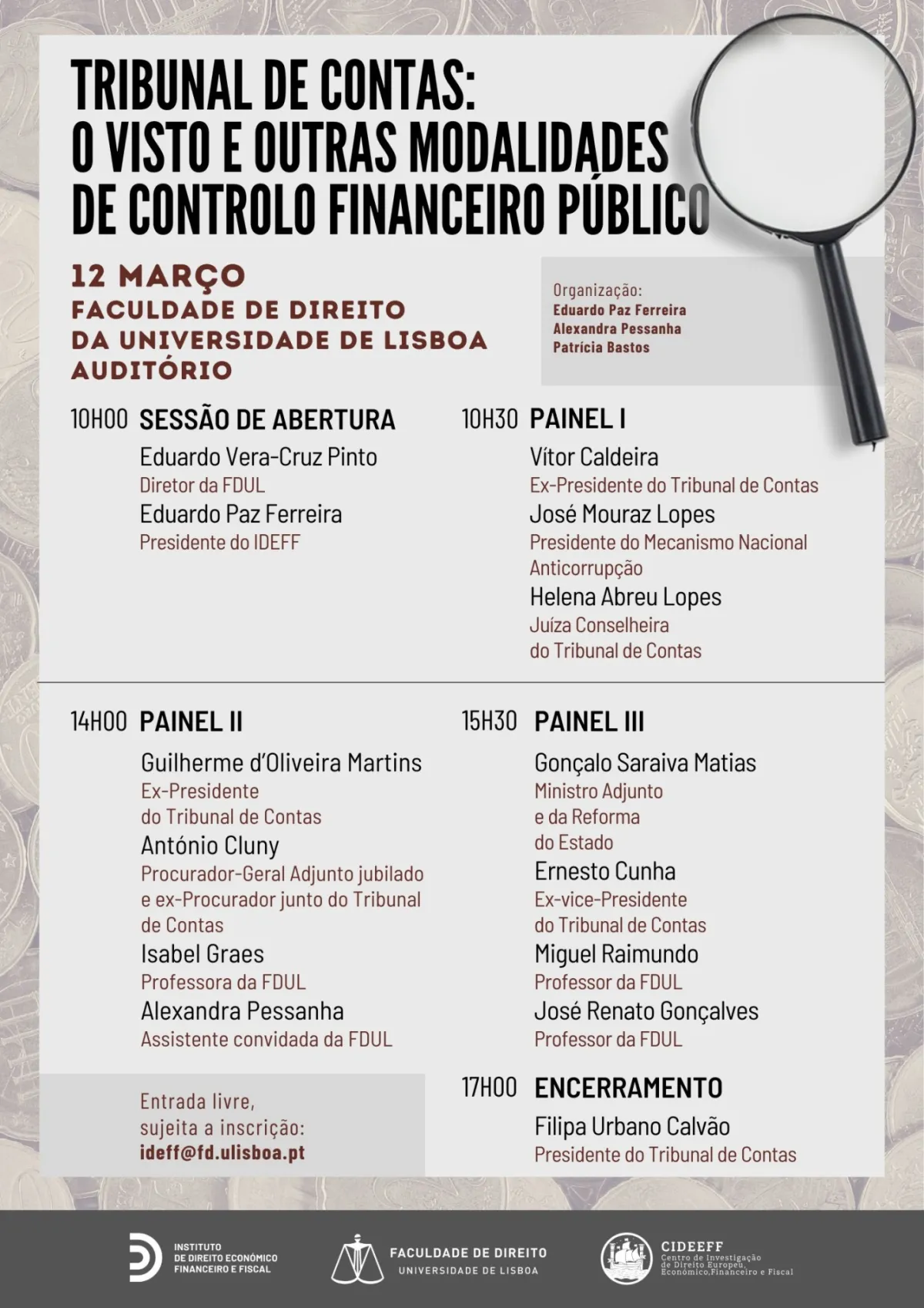 O Centro de Investigação de Direito Europeu, Económico, Financeiro e Fiscal organiza, no próximo dia 12 de março de 2026, a conferência “Tribunal de Contas: o visto e outras modalidades de controlo financeiro público”.